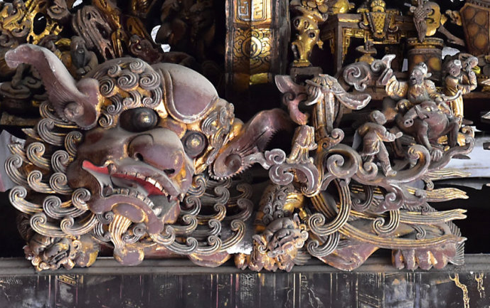 走过门楼,过前进屏门,可以见到祠堂中央的天井。天井种有花草,恬静清雅,极具潮汕古民居的传统味道。想象着在这种古居中,斟酌品味潮州工夫茶,听听潮州弦乐,那是何等的惬意。祠堂主座大厅的金漆木雕装饰是祠堂最为集中最为吸引人的地方,这些金漆木雕内容以戏曲传奇、民间故事为题材,如“水漫金山”等,用连环画幅形式,再现了白娘子与法海斗法的壮观场面。在雕刻技法上,采取了圆雕、沉雕、浮雕、镂空等不同手法,突破空间和时间的限制,形象地表现了多层次的复杂内容,是潮汕金漆木雕精品之作。更令人赞叹的是,大厅木载下两边装有十八只金漆木雕凤凰,造型传神、工艺精湛,展现出一个金碧辉煌、美伦美奂的装饰空间,充分展示了建筑和艺术的完美结合。