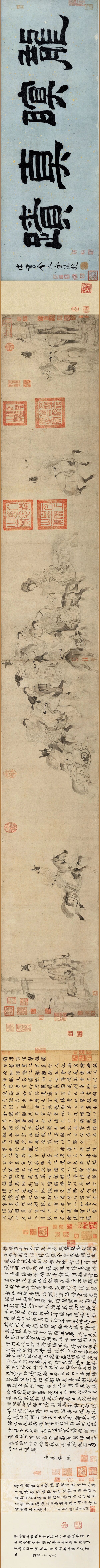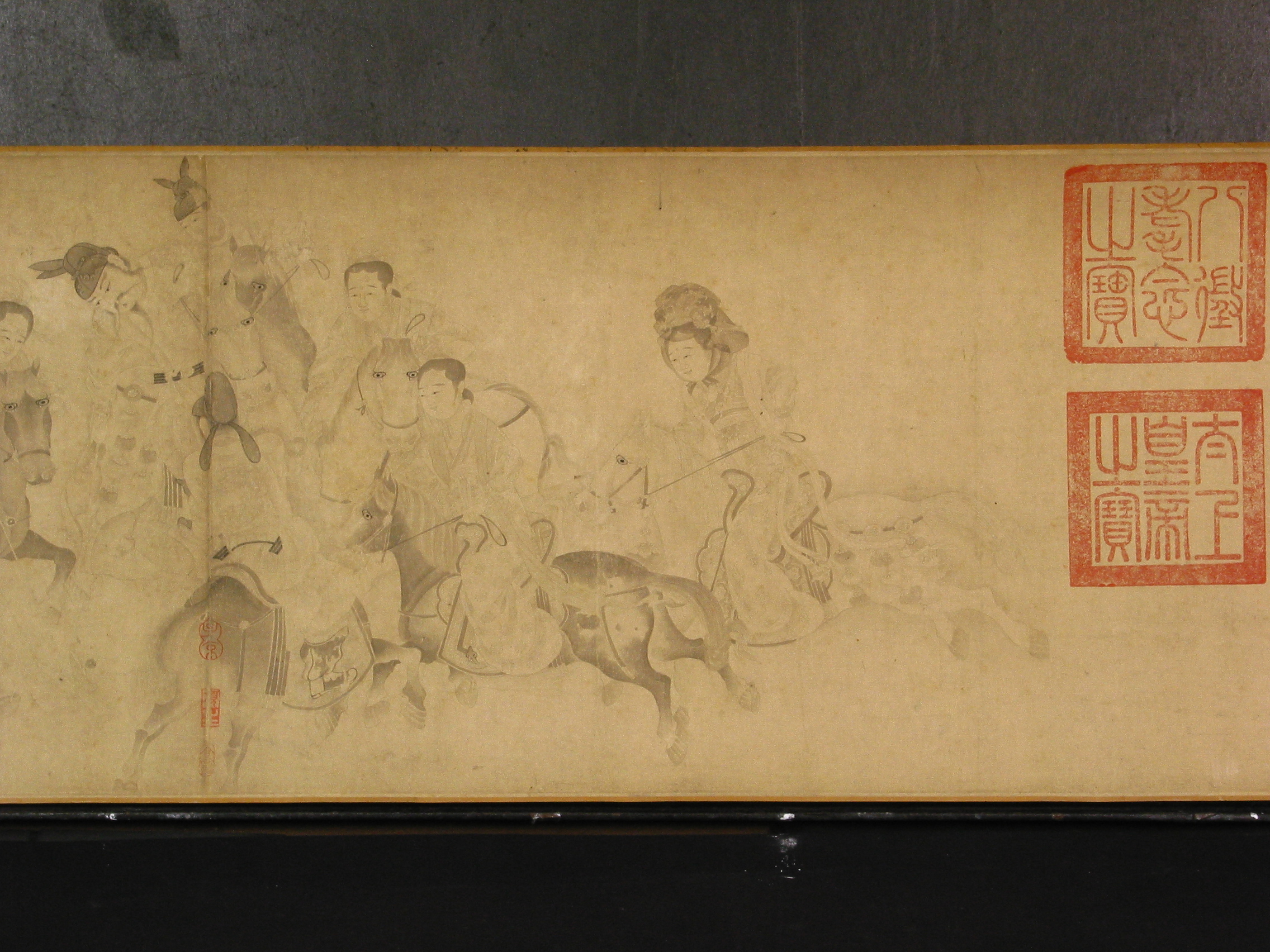 宋,佚名《明皇击球图卷》尺寸:引首高32.05 长92.2 画心高32.2 长230.5 跋尾高31.8 长318.6(包隔水)旧传李公麟作品,近人从画风研究认为应是南宋人所画。《明皇击球图卷》曾经清吴其贞《书画记》、《石渠宝笈》著录。是传世名画之一。前有明代金湜题首,后有傅著、吴乾、董其昌等跋。