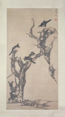 本幅表现隆冬时节,4只落寞的寒鸦在残石败枝上栖息的情景。寒鸦的羽毛先以淡墨晕染,趁湿在淡墨上罩以浓墨,浓淡墨交融处显现出羽毛柔软、细密的质感。鸟的眼眶为一笔圈成的椭圆形,靠近上眼眶处以重墨点睛,一付“白眼向人”的神色顿现笔底。鸟儿孤傲不驯的神态最能体现作者坚韧倔强、磊落不羁的个性。本幅款署:“八大山人写。”钤“遥属”朱文印, “可得神仙”、“八大山人”二方白文印。