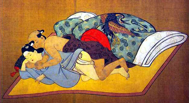 来自18世纪末期作在一张丝绸上的春宫绘画独板,重印(承蒙 Richard Lane 博士)在《武士的爱,一千年日本同性恋》由Tsuneo Watanabe 和 Jun'ichi Iwata 著。