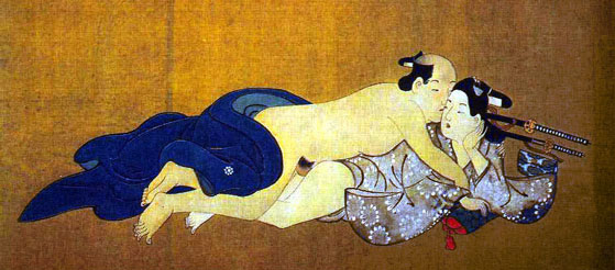 在同性爱之外是求爱的图画,我们能从中看到男人们之间丰富的情感展示,或者超越这些:欲望,情热,恐惧,柔软,惊奇,幽默。同性恋激情不胜其多。日本同性恋艺术中经常有勃起状态中的武士与他们的学徒之间的亲吻和爱抚,甚至,年轻的歌舞伎剧演员也兼作男妓。