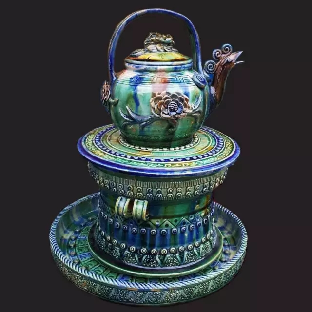 五、烧窖。使用的窑子叫阶梯窑,或爬坡窑、梭坡窑,将半成品堆放在窑子的泥板架上,泥板架共七层,每层可放10件,根据釉和泥土质量,将耐火差一点的首先放进窑子,耐火强的最后放(靠进火口、温度最高),窑子温度在900℃-1100℃。