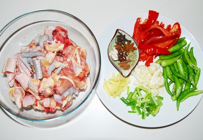 临沂炒鸡主料:三黄鸡一只、青椒、红椒