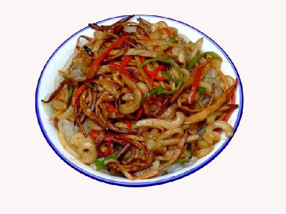 第二道:鸡汁千张贺菜 (原料:鸡汁千张,胡罗卜,肥瘦肉丝,青红椒丝)