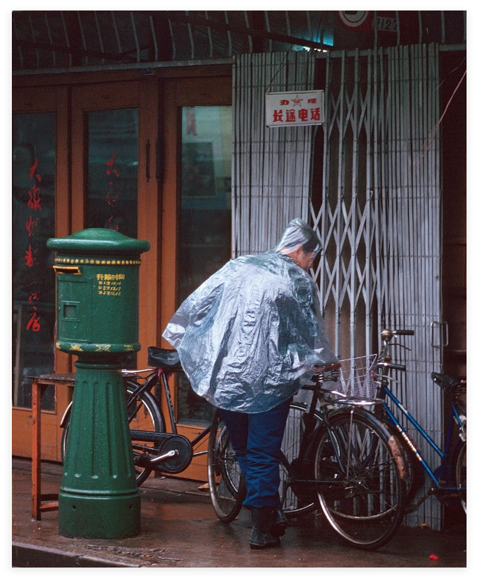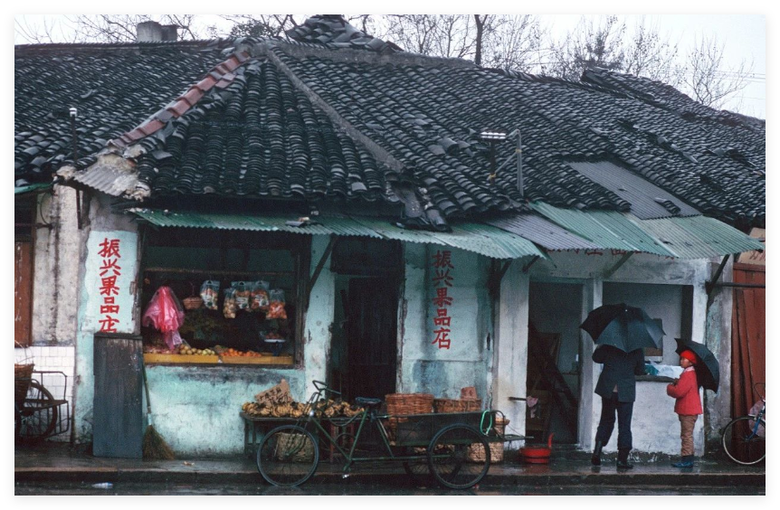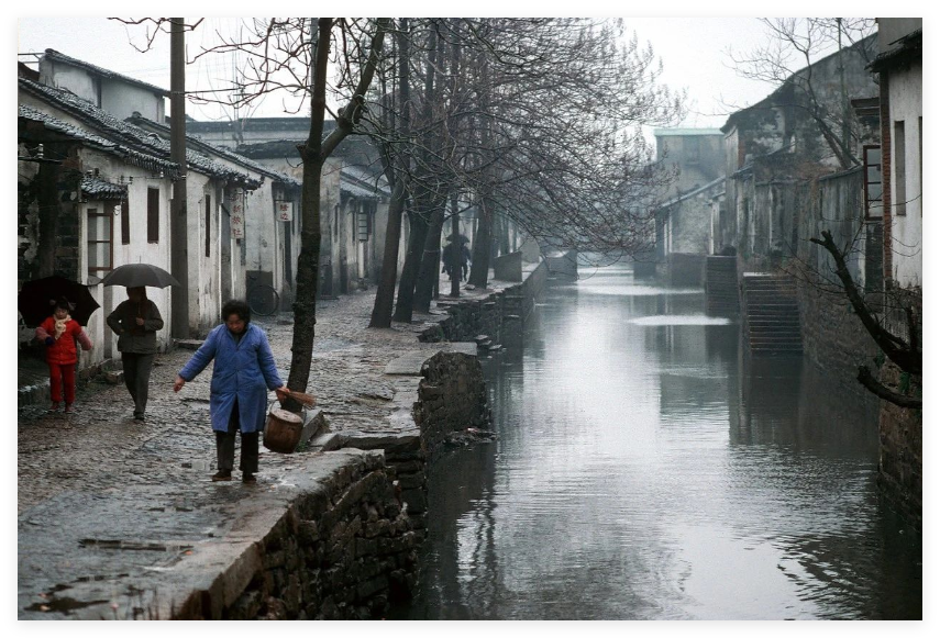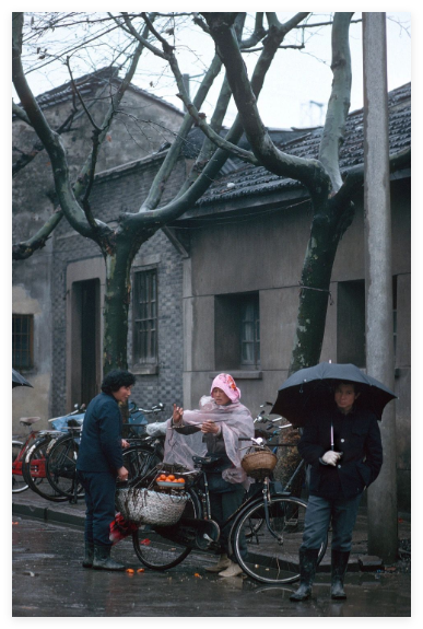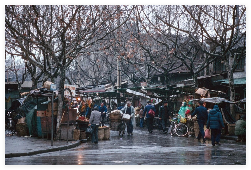 1988年苏州秋天街头老照片,秋冬季节,一片萧瑟,下雨绵绵细雨,更显萧条和寒冷。