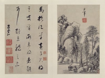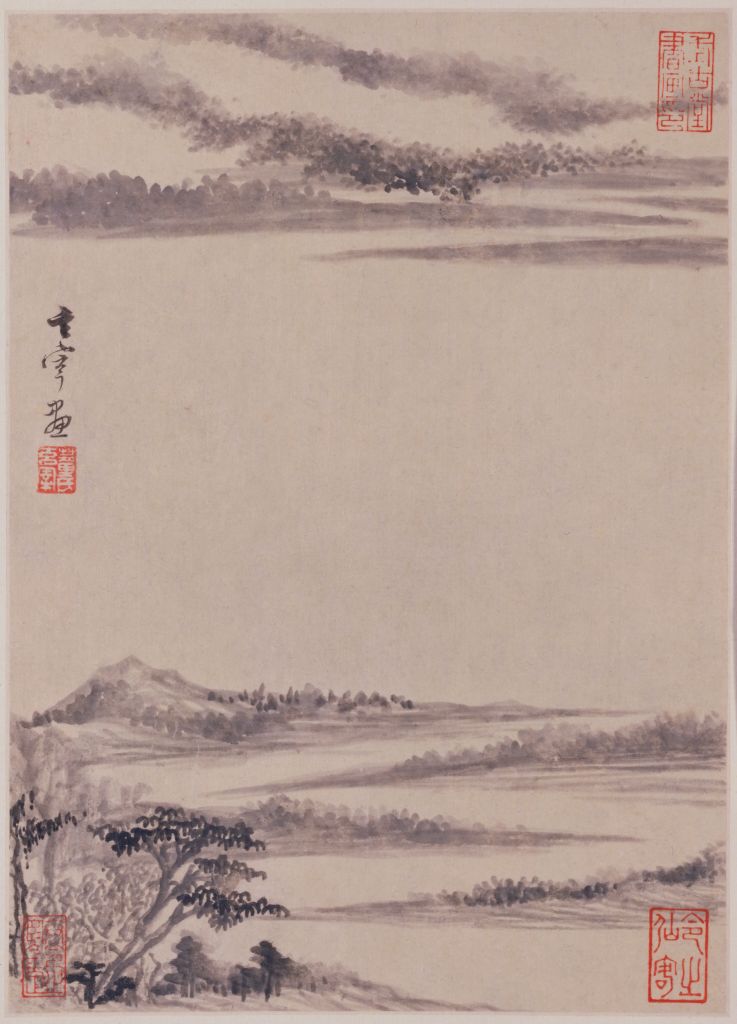 董氏深厚的仿古功力。每开品评前代大师,仿其笔意,用书法作画,尤以其擅长的行书笔意融于画中,深得各家精髓,出入各家画法,自在无碍。笔墨松秀含蓄,灵逸潇洒,富有韵味。意境萧闲冲淡,幽远静美。