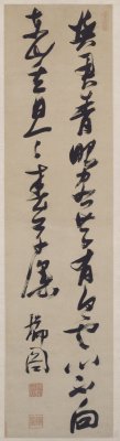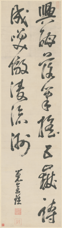 《七言诗句》轴,明,米万钟书,纸本,立轴,纵166.2厘米,横42厘米。行书,2行。