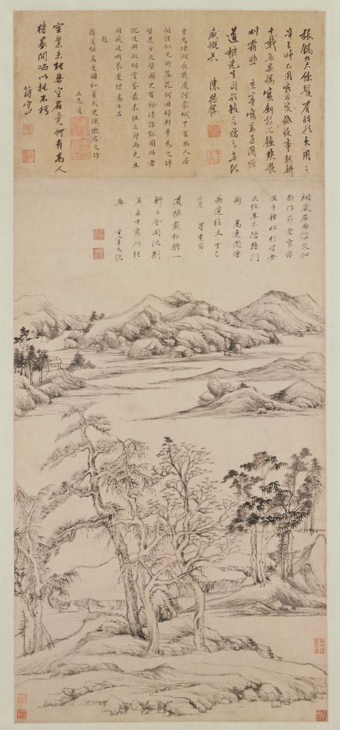 张瑞图绘画则学黄公望,风格苍劲,点染清逸。他的画作大多是偶然兴至所作,其大幅画作特点是笔墨粗放,构景空疏。