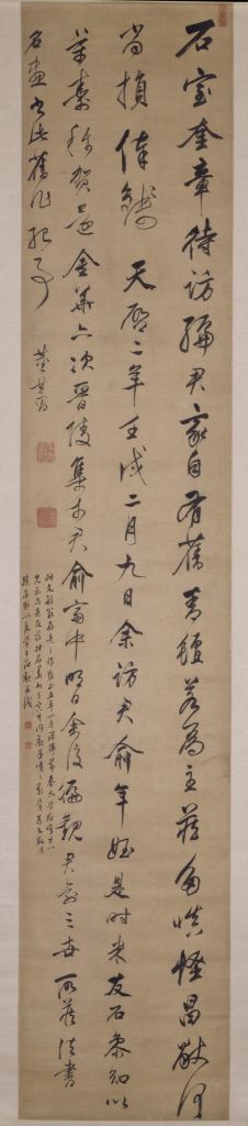 本幅自题:“冻泉依细石,晴雪落长松。庚午春仲果亭图写”,钤“瑞图”朱文方印,“张长公”朱文方印。题字结体狂怪,笔画劲健纵逸,气韵外露,颇富“奇异”之态。据此,可知此图作于崇祯三年(1630),张瑞图时年60岁,正是他罢官遣归之年。图中题句出自杜甫诗《谒真谛寺禅师》。